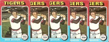 I had no idea that the one Cardboard God who seems to have made the most visits to me, with five, had a Jewish father. Just like me. (Just like Skip Jutze, too, according to Baseball Almanac. And just like Ryan “The Hebrew Hammer” Braun.) I doubt I paid much mind to any of the five 1975 Dick Sharon cards that came into my life, except perhaps to become mildly annoyed that the guy kept clogging up my new packs with his repeating self. (I doubt I even noticed the shadow of the Topps photographer visible in the picture, possibly the only time one of the medievally anonymous artisans responsible for creating the Cardboard God universe appears in any form in one of their images.)