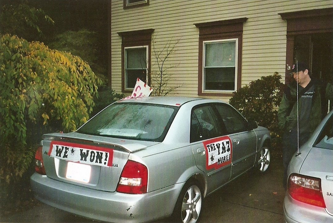 It was a good moment, but since it was my brother’s cap it should have been my brother’s moment. I tried to assuage my guilt about this with the fact that I’d soon be handing the cap back to my brother; we had decided to meet in Boston for the victory parade. I don’t know if my brother feels cheated out of his own rightful Yaz-cap moment, but if he did it didn’t stop him from manufacturing his own Yaz moment, festooning his car with Yaz-related signs and banners in preparation of the drive from his house in Brooklyn to the parade in Boston. He had decided, in short, to turn his car into The Yazmobile: