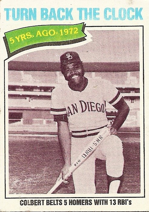 The other players with feats featured in the “Turn Back the Clock” series were either still playing or had been retired for a while at the time the cards came out. Nate Colbert, on the other hand, had just finished a two-city, sixteen at-bat, .178-hitting stinker of a final season in the major leagues. I wonder if seeing this card caused him to soak his famous muttonchops with the bittersweet tears of nostalgia, like a guy just given the boot by his true love looking at a picture of the two of them on their happiest day.