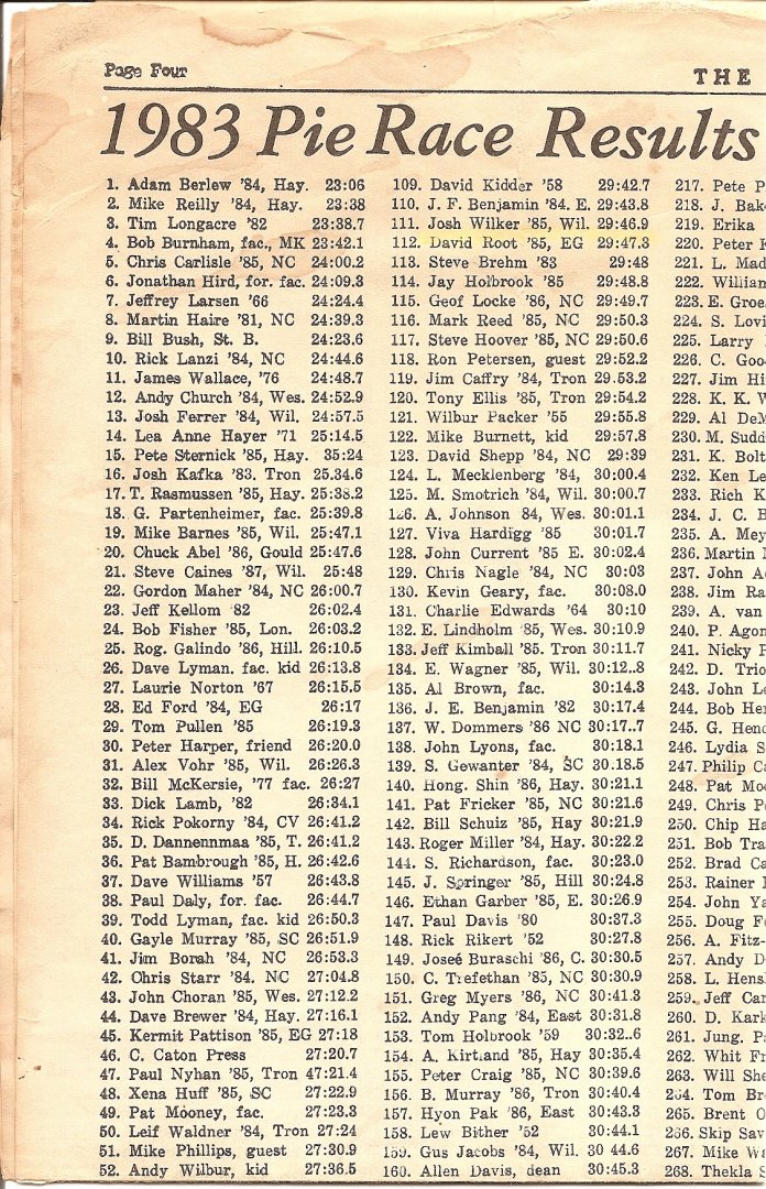 The clipping from the high school newspaper spent the early stages of its existence taped to a yellow cupboard in the kitchen of the house I grew up in. When that house was sold it went into a box, where it has remained for twenty years. It finally got jostled loose the morning I wrote about the Pie Race. As I was writing, my mom, preparing for another in a long series of moves, was going through her belongings, trying to lighten her load, when she found the clipping and put it in an envelope.