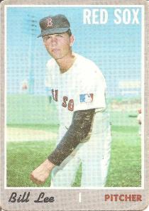 So anyway, it’s a beauty, this card—Bill Lee as a very young man in the place I love the best. I was just a year old when the picture was taken. When I was born, Bill was in the last season of a stellar college career at USC. In June, he started the final game of the College World Series, which his team won (I can’t find anything confirming that he got the win in that final game, but he was named to the all-tournament team). He rose quickly through the minors, excelling in each of his three quick stops, and was in the majors for good by 1969. His big league career spanned my childhood almost exactly, and it was a good one, over a hundred wins and a strong ERA even while pitching in a park that seemed designed to send lefties to the trauma ward; a selection to an all-star team; and eventual induction to the Red Sox’ Hall of Fame and to the Baseball Reliquary Shrine of Eternals. His career after the majors is even better in some ways in that it revealed an unsurpassed love of the game: he never stopped growing and roaming the globe and, most of all, pitching. He has played the game on practically every last shred of land on the globe. His old nemesis, Don Zimmer, is renowned for never existing as an adult outside organized baseball, even to this day holding down a job as a coach with the Tampa Bay Rays. But Bill Lee is much more impressive to me: he has never been outside of disorganized baseball, even when he was in organized baseball.