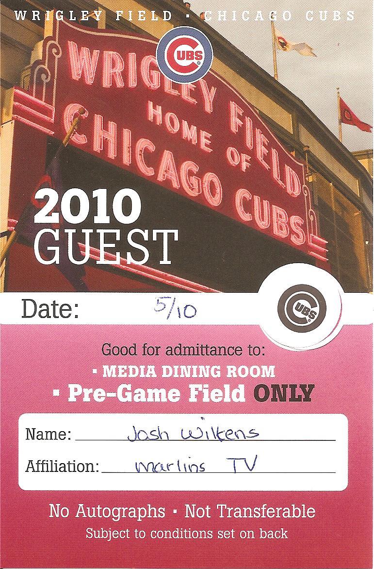 At Wrigley, I got the “2010 Guest” sticker shown here upon showing some ID. My ID does not confirm that I’m “Josh Wilkens,” but I guess it was close enough. I was early, so I sat around for a little while by the Ernie Banks statue and read the messages Cubs fans had engraved into bricks. All were statements of undying Cub fandom. One was also a marriage proposal, which seemed a gutsy thing to have engraved into a brick. After several minutes I got up and asked the Cubs employee working the media entrance parking lot which truck was for the Florida Marlins. He pointed toward a trailer with a Big 10 network banner on it. I had a stomach ache.