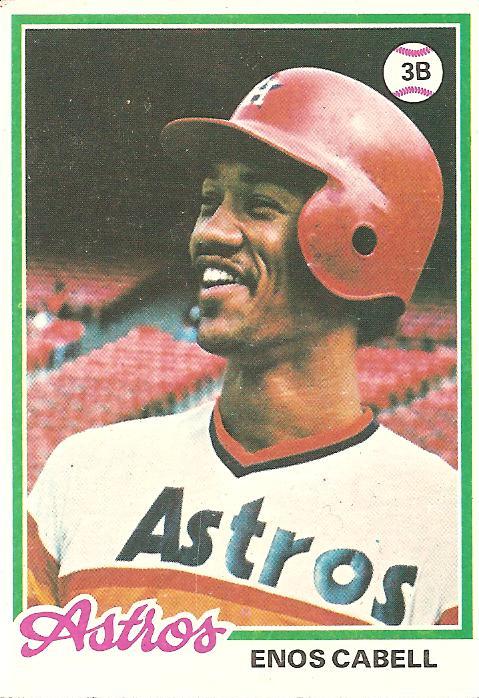 Enos Cabell is always “good” in my teenage baseball fan and card collector’s book. Excellent name: CHECK. Cool card: CHECK. Played for a team with a cool uniform: CHECK. Got some key hits against my Phillies: CHECK. Made one of the most memorable boners I’ve ever witnessed in person: CHECK. The Astros were playing the Phillies at Veterans Stadium. Cabell was in rightfield. Someone hit a line drive to him. He took it on one hop and geared up to throw home to catch a Phillies’ player turning third. He must have lost his grip. The ball went right into the ground, about 5 feet in front of him. It rolled into the infield. When you’re a kid entranced by all the unexpected things that make baseball special, what’s better than a guy named Enos Cabell dressed like a fast-food employee, throwing a hard grounder from right?