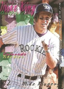 Mike Kingery toiled in the minor leagues for six and a half years before he got called up by the Kansas City Royals midway through the 1986 season. The Royals traded him to the Mariners, and in 1987 Mike Kingery played his first season of professional baseball entirely outside the minor leagues. The outfielder would log 10 seasons in the majors, and most players who manage to stick around that long don’t have to bother with the minor leagues after their earliest years, but after 1987 Kingery kept getting sent back down to the bushes, splitting time between there and the majors in 1988, 1989, 1990, 1991, and 1992. In 1993, at the age of 32, he spent the entire season in Omaha, the Triple A affiliate of the Kansas City Royals, whom Kingery had circled back around to after stints in San Francisco and Oakland. He hit .263 for Omaha with a .325 on-base percentage and a .411 slugging percentage. It was the last of his 13 seasons in the minor leagues, and if you had to guess what happened next based only on Kingery’s lifetime minor league stats, you’d have to assume that it was the last of his seasons in professional baseball anywhere. Instead, he hooked on with the Colorado Rockies and, in 1994, the year just before this card came out, Mike Kingery suddenly was able to hit practically everything thrown to him. He started showing signs that he was locked in during limited plate appearances in April, became more or less a regular in May and saw his numbers start to tail off, but then he caught fire in June and stayed blistering hot the rest of the summer. On August 11, 1994, Kingery was batting .349, behind only Tony Gwynn and Jeff Bagwell in the National League batting title race.