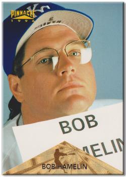 This is a terrible thing to see at 5 in the morning in my underwear. I don’t know where to start. It’s so jarring and awful, a collision of unpleasant forms and surfaces. I fear for anyone dwelling too long on this card. There should be contests to see who can last the longest staring at it before screaming into the night. I fear for Bob Hamelin, too, that he will incur a massive paper cut on his jawline, that he suffers from amnesia and so carries not only his name under the brim of his cap but also on a large paper sign stapled to his chest. I pity him. I hate him. Is it his huge face crowding the frame? Is it his air of mournful need? The hint of a mullet on one possessing such a broad, smooth face and such clean, featureless glasses seems to speak of an age in which there is no rhyme or reason, no up or down. A mullet on Jose Canseco or Rod Beck I understand, but this? It makes me want to move my family immediately to a rural fastness far from any TGI Fridays. Oh, beauty, truth, where are you anymore?