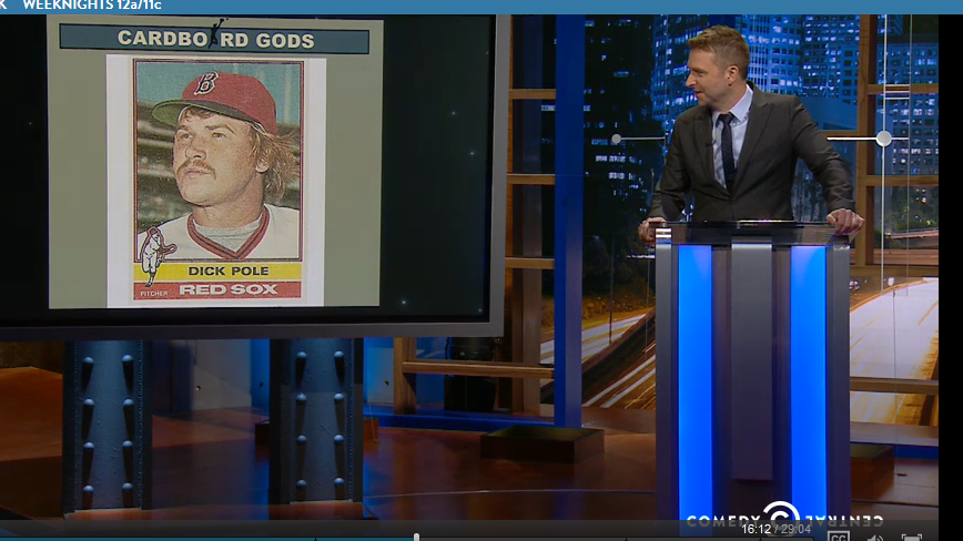 When I was a little boy living from pack to pack in rural Vermont in the 1970s, I knew my dream would one day come true of having a card from my collection serve as the backdrop for a riff session by three very funny people on a late-night cable television show. The Dick Pole stuff starts at around the sixteen-minute mark here. Particularly gratifying is that the Sklar brothers, arguably the funniest sports-obsessed comedians in the world (and the creators of the hilarious, sadly defunct baseball-card sitcom “Back on Topps”), are leading the Pole-stroking session. (Thanks to Bo Rosny for the lookout on this.)