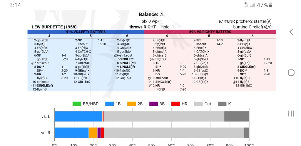 Indications thus far through my online Strat-O-Matic season are that he just might have pulled that off. Of course, some middle aged schmo’s online fantasy team results hardly rate as compelling evidence, but if you can take a leap of faith into considering them as such, the Strat-O-Matic card at the top of this page adds an interesting extension to that evidence. It’s a Strat-O-Matic representation of Lew Burdette’s 1958 season, one of Burdette’s best in a long, successful career, and it’s virtually identical to Fidrych’s 1977 card: no walks, no home runs, and a fair but not overwhelming number of hits.