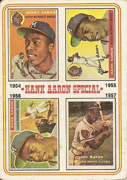 Thank you, Hank Aaron. By the time I get back to the daily boxscores you may no longer hold the record for most career home runs, but to me you always were and always will be the Home Run King. I bought my first baseball cards in 1974, when I was six and you were on the brink of breaking a record that was thought unbreakable. For whatever reason, I seemed to need gods, and I found them in cardboard rectangles, and the cardboard rectangles that held your image always shined the brightest. My family was in a new house that year, in a new town, a new state. My father had not come along. We house-sat for a year, then moved into another house bought for cheap in a foreclosure auction. The room I would share with my brother had been damaged by the evicted former owners, as had all the rooms in the house, the walls riddled with beebee holes and obscene graffiti. I have written about that house a lot, often focusing on the early days, on the feeling that something in the universe was telling me I wasn’t welcome. After those early days I went where I was welcome, into the cardboard rectangles, into the baseball encyclopedia, into library books about baseball, into the game itself, playing for my little league team whenever the long Vermont winter finally relented, playing with my brother whenever he’d agree to, playing by myself with a glove and a tennis ball and the various jagged angles of the exterior of our house. And everywhere I went into that welcoming world, you were there, Hank Aaron, shining down from the pinnacle, majestic and benevolent, the King of the Cardboard Gods.