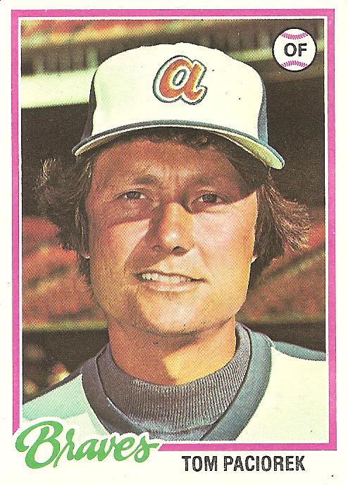 I haven’t turned this card over yet. It’s been sitting face up on my desk for a few days. I’ve had a long time to wonder about whether the close-up shot was ordered by Topps so that it would be relatively easy to doctor the card should Paciorek get traded to another team in the off-season. It seems so much like one of those doctored card shots that I had to check Tom Paciorek’s baseball-reference.com player page to make sure that he hadn’t joined the Braves in the offseason, a move that would have necessitated an inexplicably masterful changing of a previous team’s cap to the Braves cap featured here. I could have also flipped over the card to check what team he’d played for during the past season, but as I implied above, I have been experiencing quite a bit of trepidation about turning over this card to look at the back, which presumably would tell me what I learned online: that Paciorek had been with the Braves for a couple years. But someone at Topps seems to have anticipated that Paciorek was the kind of guy who might be moving on real soon, and in truth they only missed on this prediction by a few months, as Paciorek was released by the Braves in May of 1978.