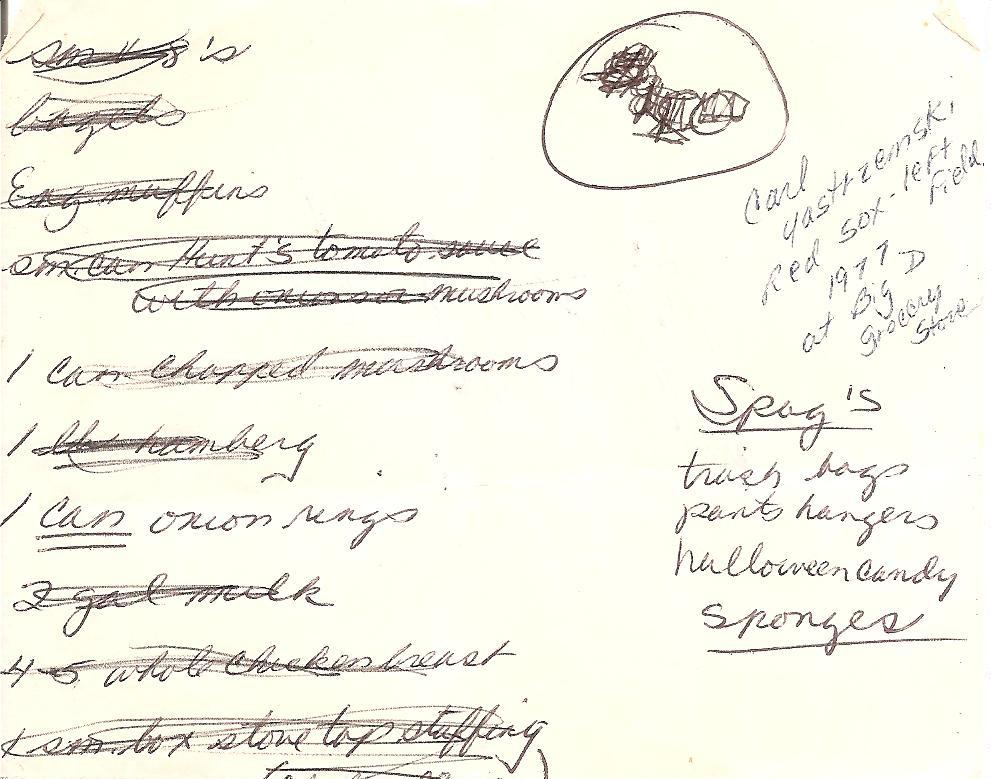 Some words jotted near the upper right corner of this side of the slip of paper hint at what is on the back of the slip. But I have waited a long time for the markings on the back of the slip to make their way to me, so I feel compelled to search for clues on how the circle that started with me sending a letter to Yaz was finally completed. I think the list along the left side may shed some light. Of all the grocery store items listed in the left-hand column, only onion rings remained elusive. A can of onion rings.