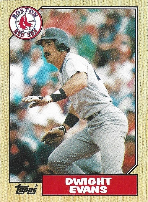 I believe that in this 1987 baseball card Dewey Evans has just released his bat. It’s a moment that was a long time coming in the progression of baseball cards in my collection. My life, or at least the part when I started being able to remember, began with baseball cards, and Dewey Evans was always there, and he was always, except for the last year in which I heavily collected cards, holding a bat. In his 1975 card, from when I was seven and first starting to collect cards and root for the Red Sox, Dewey is holding a bat, a posed shot. He strikes a similar bat-holding pose in his 1976 card. His 1977 card also shows him holding bat, this time in a game and from the side, showing him staring out at the pitcher and in the upright batting stance he used before he started remaking himself as a hitter under the demanding eye of hitting guru Walt Hriniak. In his 1978 card he’s back to a posed shot, his bat again perched over his right shoulder. In 1979, another posed shot, the bat is still there, now resting on his shoulder. In 1980, finally, no bat is included in his photo, and his expression as he looks off to the side is as if something has been taken away from him.