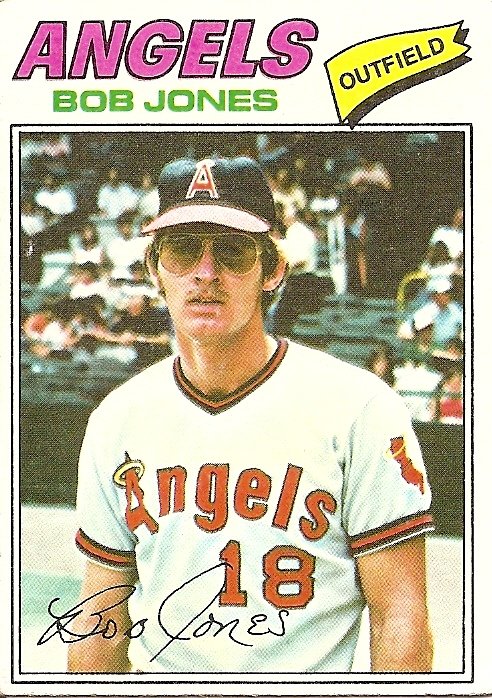 According to baseball-reference.com, Bob Jones “served in Vietnam from August, 1969 to February, 1971 and became deaf in one ear as the result of a combat injury.” I didn’t know that when I looked at this card as a kid. All I knew was that he’d had a gap in his pro baseball career, that he’d come back and had starting slowly rising, hitting .321 at Anderson in 1971, driving in 91 runs in Spokane in 1974, hitting .355 at Sacramento in 1976, that last lofty number leading to his first extended stay in the majors after two brief cups of coffee with the Rangers: 78 games with the 1976 California Angels, enough to gain him entry into the realm of the Cardboard Gods. But on the front of Bob Jones’ first-ever baseball card there seems to be no acknowledgment of his triumphant arrival. There is instead the hint of some other story that will remain obscure. Bob Jones knows the story. Bob Jones looks right through me.