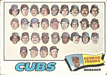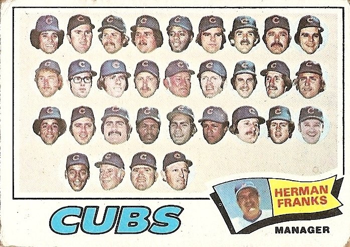 Eight years after the 1969 flop, the Cubs authored another lesser-known season of disillusionment. In 1977, the heads pictured in the card above combined with their unpictured necks, torsos, limbs, and other below-the-jaw bodily parts to race to a first-half lead in their division that grew as large as 8.5 games by June 28. They went 34-59 the rest of the way, however, finishing 20 games behind the Philadelphia Phillies. They say that when you get beheaded you are aware of what’s going on for a few seconds. You remember that you were once whole and realize that you are no longer. I wonder if that feeling is anything like being 20 games out of the money by season’s end, dead as a doornail, and thinking back for one brief second before the final out of the year, remembering how sweet life was in the middle of summer.