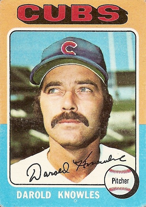 Or maybe it’s the cap, represented here not by a photographed image but in a version imagined by a Topps artist and superimposed on a photograph. The imaginary version of it is in a certain way more real than the real version in that it highlights a certain key aspect of the Cubs cap, a cap that has been the same for as long as I have been alive. It looks, atop the head of Darold Knowles, more like somewhat sloppily applied cake icing than a cap. It looks like you could eat it, like you could dip your finger into the blue and red and get yourself a nice quick sugar high. Their real caps don’t look like this, not exactly, but maybe there is something in the cap, in the mild, friendly blue, in the taming of the racier red by restricting it to the confines of the basic spelling-block C, that invites a kind of metaphorical dipping of the finger into the icing. Maybe other teams, without even knowing it, look across the diamond at the Cubs and assume the attitude of a guy walking through an empty break room at work and noticing a cake just sitting there, waiting to be violated.