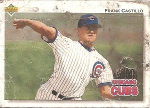 I’ve lived in Chicago for seven years now, and it feels like nothing, like I just got here. Conversely, the roughly equvalent span of seven years of my childhood during which my baseball cards came to me seems immense and inexhaustible. The writing at this site is, among other things, my surrender to the idea that it will take the rest of my life to approach saying everything I want to say about those years. Maybe I live an intentionally narrow life in the present to leave myself time and energy to explore the past. Likewise, I don’t collect cards anymore. I don’t have room for them, physically or emotionally. But I can make room for the occasional stray, like this Frank Castillo card that I found a few months ago on Western Avenue, my fourth and probably last Western Avenue baseball card find. I’ve been looking since then and haven’t found any others, on Western Avenue or elsewhere, and I just moved to another neighborhood that’s not very close to Western Avenue. My new neighborhood is on the Red Line, however, so I’ll be a short shot away from Wrigley. I’ll be seeing the 2011 Cubs in person at least a little, so I’ll get to see if this pummeled Frank Castillo card will turn out to bear any resemblance to the Cubs’ fortunes in their 103rd straight season of wanting.