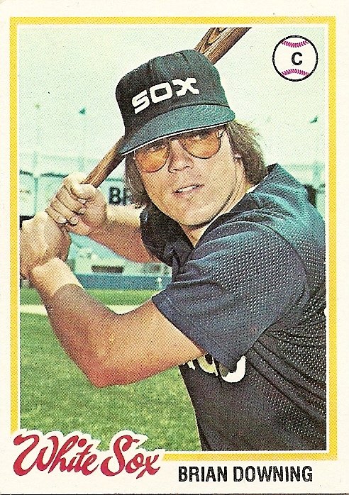 So I turn today to Brian Downing for a little help. Here he is, in his tinted aviator shades and mesh, the same partially obscured Brut billboard in the background that was in the background of Ron Schueler’s card. Even though the viewer of both cards would assume from the identical backdrop and team name on the cap that Brian Downing and Ron Schueler shared the same moment with a Topps photographer, the two were never teammates. While newly acquired White Sox pitcher Ron Schueler was wrapping up the last two years of his career as a roaming adjunct, Brian Downing, now of the California Angels, was beginning to shuck off the costume of invisibility that had cloaked him throughout his years with the White Sox. It happened gradually. In 1978 he seemed the same innocuous weak-armed part-time backstop he’d always been, then in 1979 he batted .326 and made the all-star team, which seemed like a once in a lifetime aberration over the next two seasons, during which he hit .258 with 11 home runs.
