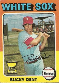 Here is the tragic figure of Bucky Dent, the mildly promising albeit light-hitting young Chicago White Sox shortstop who after being named to the Topps all-rookie team in 1975 was killed in a horrific wood chipper accident. Though some are of the opinion that this accident is a myth, and that Bucky Dent actually went on to play for several more years in the American League, at times even excelling as a power-hitter in key late season moments (a preposterous claim given his slight frame and complete lack of power-hitting skills), I offer as primary countering evidence the fact that this is the only Bucky Dent card in my entire collection, and if he had indeed played beyond this year the only way to explain his absence from my collection would be to say that I assiduously removed and destroyed any later Bucky Dent cards, as if for some reason the very sight of them caused me revulsion. But why on earth would I or anyone waste time doing something like that? Clearly, the stronger Bucky Dent theory is the one in which, tragically, Bucky Dent was thoroughly minced or possibly even pureed by a wood chipper before he was ever able to make any significant impact on major league baseball history or on the innocence of, say, a 10-year-old Red Sox fan in East Randolph, Vermont, on October 2, 1978.