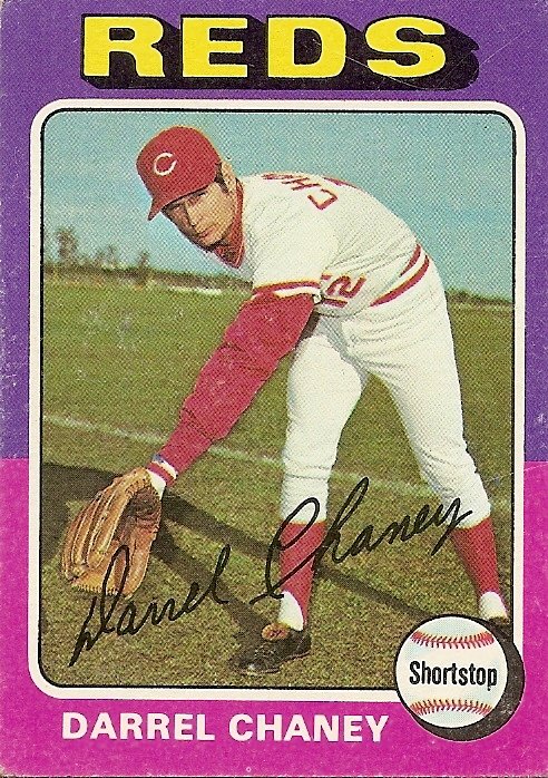 I don’t know if I would have been able to write about Darrel Chaney if his hard-nosed talents had been better represented by the photo on his card. I realized today that one reason I have written relatively few profiles of Cincinnati Reds players from the 1970s is that I can’t really relate to excellence. So Chaney, a tough, humble, do-anything-to-help-the-team-win utility guy on a couple pennant winners and a World Series champion, would leave me nothing to connect to had he been shown in a photo bravely turning a double play despite the marauding spikes-high efforts of a baserunner. But that is the beauty of my Cardboard heaven. All become strange and failure-laced. Here Chaney stoops like an arthritic amputee with one freakish arm as long as his legs, his eyes mean slits, his skin pale, his lips thin and sour, like those of a corrupt medieval bishop. He reaches for an imaginary grounder, not getting in front of it. He reaches for his shadow. It eludes him. He reaches for his name. He’ll catch a shred of it, the top loop of the D, but no more, as it slides past him and disintegrates. He will remain forever on this side of the white chalk line.