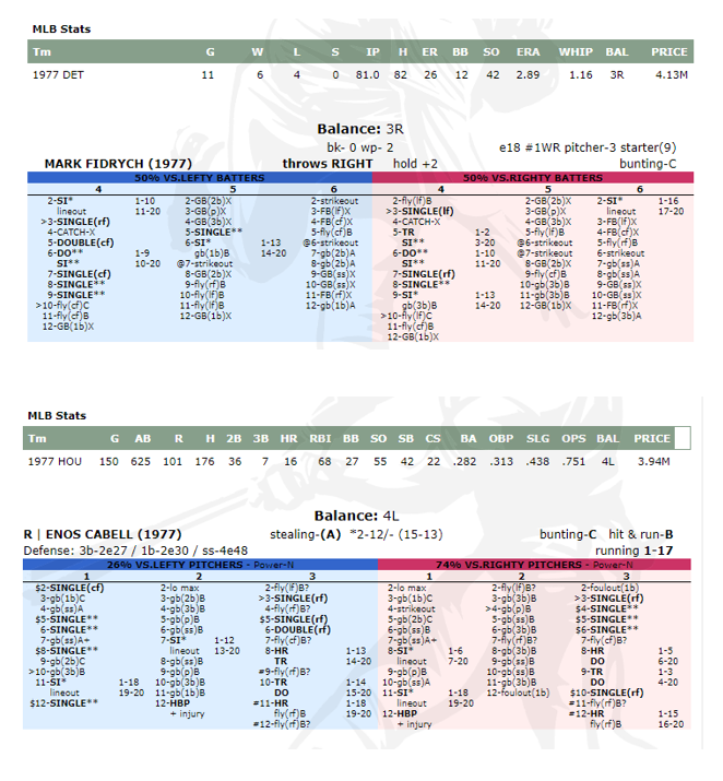 I built my Worcester Birds roster not only to bring Mark Fidrych back to life but to right the one disappointing element of his 1976 season: that he fell one shy of 20 wins for the season. I should say that I no longer mark that or anything else about Mark Fidrych’s career or life a disappointment, as in his brief playing career he gave us all more than we could ever hope to ask for from a baseball player, and in his life he figured out a way to overcome his own disappointment at the truncation of his ability to do the thing he did better than all but a few people in the world and live a meaningful, happy life that brightened the lives of his family, his town, and his fans. In both his career and his life, the end came too soon, but he made the most of his time and made the world a better place. All that said, when I was a kid I definitely was disappointed that he fell one short of 20 wins in 1976. To say I loved the round numbers and numerical milestones in baseball is putting it too lightly. When I was a kid those numbers gave shape to my life in a way that nothing else did. I wanted the Bird to come back and win 20 in 1977, and when that didn’t happen I wanted him to do it in 1978, and then 1979, and then 1980, and even after he disappeared from view at the major league level I knew he was at Pawtucket, and I kept hoping for what I understood was an impossible return to form. And now, decades later, I’m trying to give him the 1977 season I’d hoped for. It’s a tall order, as his 1977 Strat-O-Matic card is good but not great, and he can only take the ball once every five days, rather than every four days. He’s got to make his starts count, and he’s got to have help from his fielders and his offense.