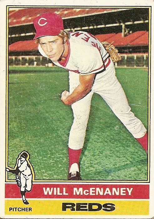 I started this morning with a baseball card, a 1976 Will McEnaney. In the lower left of the card is an icon of a pitcher. The 1976 cards all had these icons showing an ideal version of the player’s position—left-handed pitcher, right-handed pitcher, catcher, first base, second base, shortstop, third base, outfield. I would venture to guess that few, if any, of the cards from that year featured the real player so closely aping the ideal player as the Will McEnaney card. In fact, Will McEnaney appears to be someone here who knows nothing about pitching (and, judging from his pained, ironic expression, cares even less) and is inexpertly contorting his body into a pantomime of a pitcher by imitating some idealized version of a southpaw.