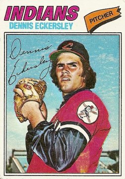 Anyway, here’s Chief Wahoo himself riding on the shoulder of the Eck, shown here in the first of his many lives in major league baseball (those lives being, in order, young flamethrower for the lackluster Indians, ace and would-be savior of the powerful but pitching-desparate Red Sox, washed-up meatballer for the Cubs, Hall of Fame-caliber bullpen ace of the A’s, and, finally, journeyman reliever-for-hire). On the back of this card I see that he played his first season of pro ball in Reno at the age of 17. The following year, also in Reno, he struck out over 200 batters, and by the age of 20 was in the major leagues. In this photo he is 21 or maybe 22, and he already has 26 big league wins and is months away from pitching a no-hitter. His storied early success with the Indians makes his trade to the Red Sox seem, in retrospect, a bit like the more recent coming of Josh Beckett to Boston. In Eck’s first season with the Red Sox, 1978, he seemed to be the final huge piece of the World Series Championship puzzle, the brilliant young ace they needed to complement their aging resident Big Game Pitcher (in this analogy, Beckett is Eck and Curt Schilling is Luis Tiant). In the end Eckersley’s worthy efforts–he won 20 games in 1978–were not quite enough to win the division for the Red Sox, who fell in a one-game playoff to the Yankees, just as they had 30 years earlier in a one-game playoff against, who else, the Indians. That year the Indians went on to beat their partners in questionable baseball team names, the Braves, in the World Series, their last such triumph. They came close in the 1990s but always seemed to lack that dominating ace, their hitting-rich teams resembling the pre-Eck Red Sox of the 1970s. Now they have not one but two aces every bit as good as Eck ever was or Josh Beckett is, C.C. Sabathia and Fausto Carmona. The Red Sox, on the other hand, have, after Beckett, an old man who has lost his fastball, a knuckleballer with a bad back, and a rookie from Japan who seems to have run out of gas months ago.