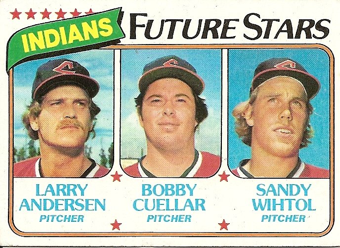 Here are three of those gods, Future Stars that foretell of a future that will never escape the abundant limitations of the present. None of the men are that young, each with several seasons in the minors under their belt. One, Bobby Cuellar, had surfaced in the majors three years earlier but would never surface again. Another, Sandy Wihtol, would briefly seem the most successful of the three, appearing in 17 games in 1980 while his fellow Future Stars continued riding minor league buses, but Wihtol would be back in the minors the following year. The third Future Star, Larry Andersen, after seeming at first to be bound for the same oblivion as his cohorts, instead caught that long, steady wave that middle relievers sometimes catch, their major league careers stretching on and on for one franchise after another, their longevity finally imprinting some awareness of their name of the minds of casual fans, who are always surprised when these riders of the long, steady wave, who they thought had been jettisoned from the majors years ago, appear in a game.