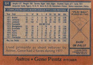 In 1977 1978 all Topps cards included, on the right-hand side of the back of the card, game pieces in something called “PLAY BALL.” I never played the game that I can remember, which is surprising given the fact that I filled many otherwise empty hours playing imaginary solitaire baseball games of every variety, using dice, using Nerf, throwing a tennis ball against the garage or off the roof, whacking a whiffle ball around the yard, even setting up marbles in fielders’ positions on the floor of my room and knocking the “pitcher” marble against the “hitter” marble. In all this time that I’ve been scrutinizing and writing about these cards, many of them from 1977 1978, I have barely noticed the game, and I only gave it a second look on this Gene Pentz card because the game occurrence mentioned—base on balls—seemed a particularly cruel choice by either the gods of randomness or the employees of Topps, given Gene Pentz’s chronic and ultimately career-truncating inability to consistently throw strikes.