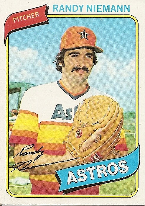 I decided to start the day by writing about Randy Niemann because of his mustache and his expression and his pose and his uniform and my indecisiveness and my lack of any other plan and my inability to make a plan or if a plan is made to stick to it and because over a year ago I started writing about baseball cards and when I started I did it every day and wrote about cards chosen at random and over the months stopped writing every day and wrote not at random but after long consideration and with thought toward big pretentious far-ranging essays and now I just want to get back to the basics and also on top of that I wonder almost every day and have wondered almost every day even since the beginning if I was done with all this, if it had run its course, if I was utterly out of things to say about baseball cards. But writing about a baseball card is just like anything else. It is like getting out bed in the morning. It is like going to a job. It is repetitive. It is boring. Existence, man, fuck. Yes, but still we go on. We have pebbles in our pockets. We have scraps of paper. We have nothing. We have Randy Niemann. I have been writing about this for 4 minutes. I wanted to write without stopping for 10 minutes. I do that sometimes when I have really reached the end of inspiration, when I just sit and stare and find myself waiting around for lunch and then dinner and then death but I don’t really want to die. I want to live! I like life. I love life. I do not want life to end. I want to keep writing about Randy Niemann forever. There is a Russian novel in me about Randy Niemann, I swaear. I mean swear. I cannot spell but there is no time! The mustache is well groomed and contributes to a face that seems to hold some anxiety and some irony too. You want me to throw that pitch? That pitch will not succeed but what the hell I will try.