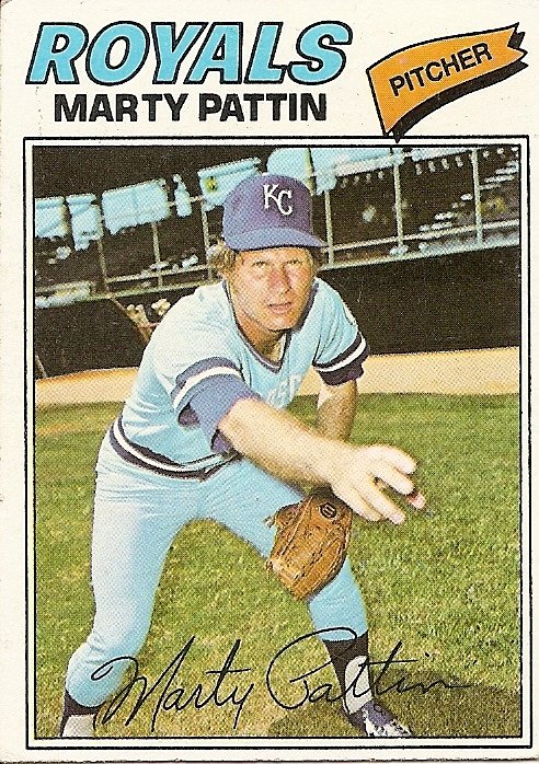 I don’t know if Marty Pattin is actually on the brink of spiraling home in this photo. I could look it up of course, but sometimes I like to rely only on these cards and my memory. The card says he is 33 years old and that he has just gone 8 and 14 for the 1976 Royals. The memory says the 1976 Royals were really good, maybe too good to retain a 33-year-old 8 and 14 pitcher for too much longer. The memory is unclear on whether Marty Pattin endured throughout the Royals’ impressive run of division titles or conversely whether he vanished. He kind of morphs into Mark Littel a little in memory, a long reliever type far from the frontline status of Gura, Splitorff, and Leonard.