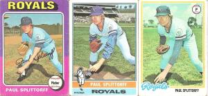 This morning, after spotting some news on the Internet about Paul Splittorff, I looked for him in my collection and found the three cards at the top of this page. At first brief glance I wondered if Topps had reused a photo of him for more than one card, as they’d done once in a great while with other players. But on a closer look it became clear by the variations in backgrounds behind Paul Splittorff and by the variations in clothing worn under the uniform of Paul Splittorff that the while the world around him changed, Paul Splittorff remained as unchanging as humanly possible, a still point, or maybe more accurately—judging from the arresting similarity from year to year in the shadow he cast—some kind of human sundial, a way to know time.