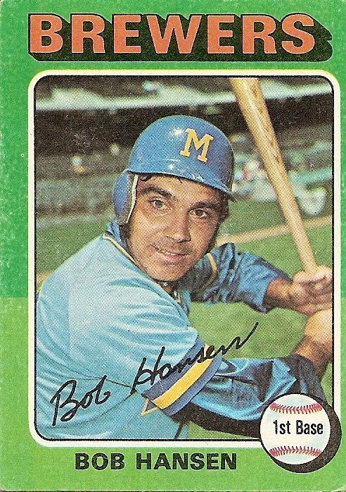 This is Bob Hansen’s only baseball card. After several years in the minors he had gotten the callup the season before, 1974, and had done well, hitting .295 and, as the back of the card puts it, “time and time again [coming] through with key pinch-hits in clutch situations for Brewers.” He didn’t get back to the big club again until 1976, his .164 average in just 61 at-bats prompting neither the Brewers to give him any further looks nor the Topps company to produce any more cards in his likeness.