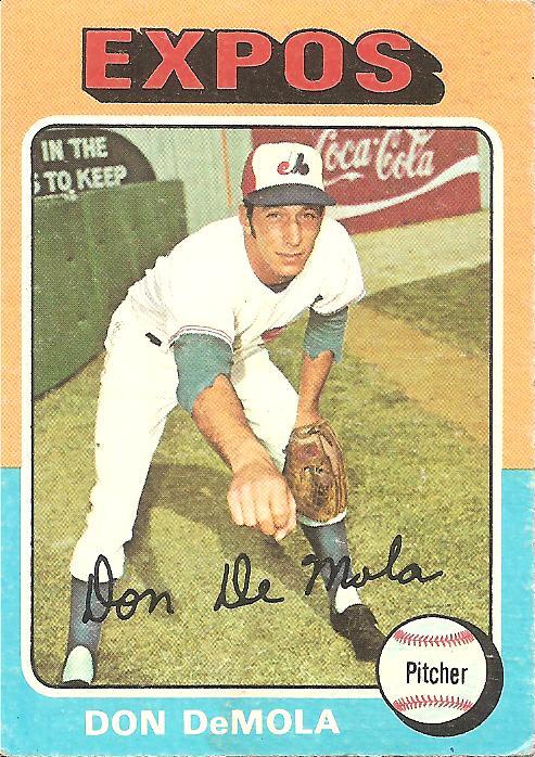 It took exactly nine months beyond the reach of numbers, like some kind of second embryonic passage, before Don was signed in January 1973 by the Montreal Expos. Back among the organized, Don sped up through the Expos system and within a couple years reached the big leagues and made it onto a baseball card, this 1975 offering, his first and second-to-last cardboard incarnation, which references Don’s rare skill: “Don’s best pitch is a fastball which ‘smokes.’” His minor and major league strikeout totals, which in most years hovered near the elite one-strikeout-per-inning mark, also attest to the wonders inside the seemingly normal arm he holds out toward the viewer on the front of the card. His small smile and the reaching arm ending in a loose fist make Don DeMola seem like a friendly, generous guy, someone who wants to share a handful of M&Ms with you.