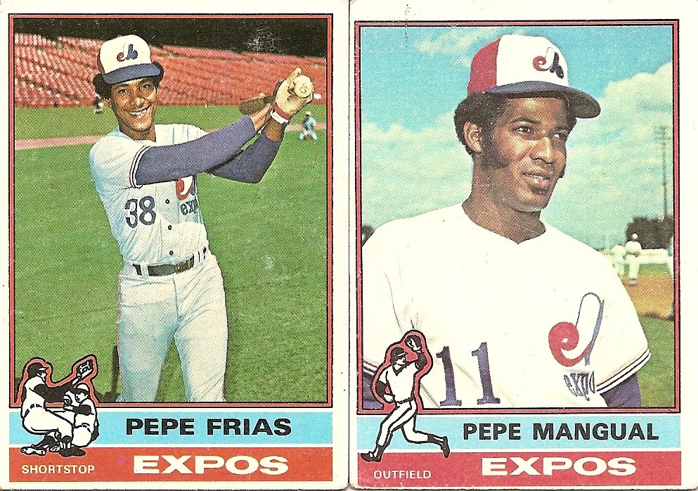 Here are the only two Pepes in the entire history of major league baseball, poised on the brink of their team’s putrid 1976 season. The Era of the Two Pepes had begun in 1973, when 24-year-old Frias made a major league roster that already included 20-year-old Mangual, who’d broken baseball’s Pepe line by playing a few games the previous September. The versatile Frias, who could fill in for regulars at three infield positions and who (along with Otis Nixon) will be in the record books until the sun explodes as the most-used pinch-runner in Expos history (despite the apparent lack of speed suggested by his mere 12 career stolen bases), got into more games during the first two of the two-Pepe seasons, but then in 1975 Mangual took the lead in Pepe appearances by becoming the Expos’ everyday leadoff hitter. Mangual’s status as the top Pepe continued in 1976, but this seemed not to be a recipe for success as the Expos swiftly plummeted from longtime middle of the pack also-rans to a borderline entry into the discussion of the worst teams of all time. By the end of the 1976 season the Expos had dropped 107 games. Worse, all the losing spurred the increasingly desperate Expos to trade Pepe Mangual in midseason to the Mets, thus banishing the short brittle epoch of the Pepes to the dustheap of history.
