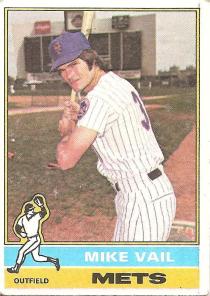 This 1976 card is Mike Vail’s first. His rookie card. It suggests in the understated style of the 1976 series of Topps cards that a stellar career may have just begun. The previous season, the player shown here with a determined expression on his All-American granite-jawed visage won the International League batting title, and then in a late summer call-up to the big leagues he produced a feat that more than any other came to loom over the Mets’ subsequent late-1970s nosedive back into the National League basement as a haunting specter of promise unrealized. Vail hit in 23 straight games in 1975, tying a rookie record and setting the Mets’ team record. The Mets figured they had found a future star and promptly shipped the anchor of their lineup, Rusty Staub, to Detroit. Vail injured his foot playing basketball in the winter of 1976, and this injury is often cited as the reason Vail never fulfilled the potential suggested by his hitting streak, but it seems more likely, judging from both his minor league stats (he never hit for power or stole many bases, even before the injury) and his record in later years (for a couple seasons with the Cubs, as a part-timer, he put up numbers equal to or superior to his 1975 marks), that Vail just wasn’t the superstar everyone hoped in his first major league moments he would be. He was a decent right-handed platoonist who could, in a good year, dump enough singles in front of the opposing left-fielder to hover near the .300 mark. He was never going to be, as in the wildest dreams of Mets fans watching his streak unfold, the next Joe DiMaggio. But what can you do? Being a sports fan is about having and holding onto wild dreams.