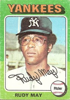 Like Bobby Murcer, Rudy May had two tours of duty with the Yankees that lucklessly came just before and just after the team’s 1977 and 1978 World Series triumphs. This perplexing card signals Rudy May’s initial arrival in New York, though it actually came out after he’d already played half a season for the Yankees. The fact that he’d already appeared in games with the Yankees, wearing a real Yankee uniform and a real Yankee cap, makes it difficult to understand why Topps had to resort to what may be the poorest bit of card doctoring I’ve ever seen. The uniform shirt looks like a piece of college-ruled notebook paper that sat out in the Topps parking lot all through a snowy winter and sun-drenched spring, and the interlocking NY on the cap appears to have been rendered by a distracted gorilla brandishing a tube of Crest toothpaste. The N in particular seems to have a sordid, malodorous life all its own, the part of the letter on our left like the staggering in-buckling leg of a drunkard, the letter-ending flourish on the right like the drunkard’s wilted flowers, offered in an ill-fated attempt to gain reentry to the apartment of his beleaguered erstwhile mate who hurled him out onto the street after ten or twelve too many booze-related fuckups.