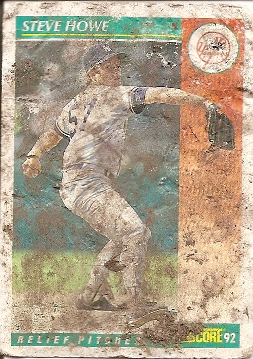 The back of the card at the top of this page is barely readable, the stats and text faded and covered in dirt. Some fragments are readable: “not pitched in the major leagues for three years . . . personal problems . . . scintillating 1.52 ERA.” By squinting I can make out the years he pitched, gaps between years like missing cards in a baseball card collection. He kept getting suspended for using cocaine, then kept getting reinstated because he had what may have been the best left-handed arm to ever grace a bullpen. This card, from 1992, was by the time it appeared already outdated in its politely oblique recounting of his travails, as Howe had been busted once again at the end of 1991 for cocaine possession, a misstep that would earn him a lifetime ban from commissioner Fay Vincent. The ban didn’t stick, and Howe returned the following year, then in 1994 posted yet another of his astonishingly effective seasons (1.80 ERA, 0.875 WHIP). It was his last hurrah, and after two relatively ineffective campaigns he was dumped by the Yankees, and two days after that was arrested at JFK airport for carrying a loaded .357 Magnum. While driving drunk he got in a bad motorcycle accident the next year, and a couple years later was suspended from coaching his daughter’s softball team. Howe stayed out of the news for several years after that, a gap that implied that he finally found a way to deal with the feeling that something was missing. But two years ago today, while under the influence of crystal meth, Steve Howe flipped his pickup truck and died.