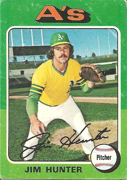 This 1975 card of the ace of the Oakland A’s surely wowed me, first pulling me in by the imagined game of catch occurring between the pitcher and the person he was staring in the eyes. The thrill of playing an imaginary game of catch with a major leaguer increased with the intimations of immortality on the back of the card. First, there was the unprecedented focus of the trivia question on the subject of the card. In most, if not all, of the other 1975 back-of-the-card trivia questions, the information did not concern the player on the card, but Jim Hunter rated special treatment, the question asking, “What is Jim Hunter’s nickname?” The answer is upside down below a cartoon of a mustachioed player holding a bewhiskered fish. And after turning the card upside down to learn that Jim Hunter is in fact Catfish Hunter, the perfect baseball name, I turned the card rightside up again and scanned the numbers, the wins piling up in a satisfying repetition of twenties. I didn’t know a lot about baseball yet, but I knew the difference between winning and losing, which was the difference between good and bad, and I learned early on that a pitcher with twenty or more wins in a season had a kind of monumental solidity unmatched by anyone else in the game. And Catfish Hunter won twenty games year after year after year.