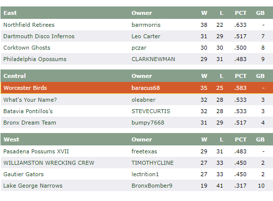 The guiding principle for my team, in terms of run prevention, was “bend but don’t break.” To save money for everyday players who could hit well and field well, I loaded up on cheap pitchers who gave up a lot of hits but kept the ball in the ballpark (Fidrych himself being a mid-priced and slightly less batting-average-friendly version of this type) and hoped that my team would limit the damage invited by the mushballers by giving up fewer home runs than the league average, by not giving away runs with errors, and by leading the league in double plays. So far, so good: the Worcester Birds have given up six fewer home runs than the league average; are tied for the league lead for fewest errors; and lead the league in double plays. The team is eighth in a twelve-team league in runs allowed, but because the offense is second in the league in scoring runs, the mediocre run prevention, bolstered by spectacular fielding at every position, has been good enough so far to keep the team in first place.