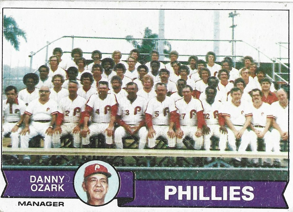 That’s the spot in the standings to which Larry Bowa was most accustomed. He’s presumably somewhere in the team photo at the top of this page. Something mysterious happened to a few teams from my childhood collection of cards, including the Phillies, and I don’t have a single Larry Bowa card. It’s fitting perhaps that my only relic of him in my collection makes him indistinguishable from his teammates, as Bowa seems to not have cared about individual achievements but only about winning as a team, which the Phillies started doing in the middle of the decade and didn’t stop doing until Bowa was traded away (to the Cubs, who started winning as soon as Bowa was aboard). In an enjoyable recent episode of the Lost Ballparks podcast, Bowa says, “I didn’t care about any of that stuff [individual achievements]; I just wanted to get a ring. . . . Everyone can take everything away except for the World Series. That’s what I played for.”