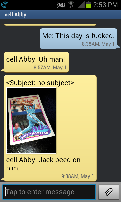 The image shown here shows a conversation with my wife in which I tried to express my frustration with a long delay in the bus that I sometimes take to work. When you’re in your own head, you can often come to the conclusion that things are fucked. Sometimes what you need is a little levity, a little sense of connection to someone else, a little talk about the hazards of being a late 1980s baseball card lying around the house of a toddler.