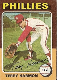 In 1967, the first year listed on the back of this card, Terry Harmon was the sound of one hand clapping. He had no at bats, no doubles, no triples, no home runs, no runs, no RBI, and a batting average of .000. He existed without existing. Other members of the 1967 Phillies, unable to recall Harmon ever being around, were surprised in later years to see his grim, robotic visage among familiar faces in the team picture for that season. There is no listing on the back of this card for 1968, evidence perhaps that it is possible to do even less than nothing. In 1969, Harmon commenced churning out a few generically forgettable seasons, blooping enough broken-bat singles in limited action to bat in or around the low .200s. I don’t know if this means anything, but I was born during Terry Harmon’s less-than-nothing season of 1968; furthermore, the birth occurred in Willingboro, New Jersey, and as far as I can tell the only Cardboard God ever to have had anything to do with Willingboro, New Jersey, seems to have been Terry Harmon, who resided there when this photograph was taken of him reaching for a groundball that will never arrive.