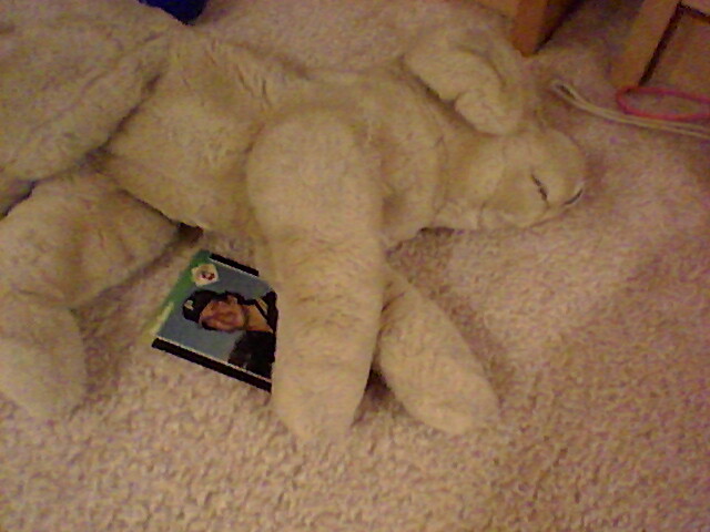 And yet, I still imagine my face getting smashed in on a fairly regular basis. Life is one fucking invisible worry after another, one thing breaking after another, one long day after another. And now, for me, there’s a small boy in the center of it, not even two years old, and it’s up to me to protect him, as if I could do so by draping my arm around him like the stuffed dog in this photo is doing to Jim Gott, one of the cards my son plays with sometimes. But I can’t protect him. I’m at the mercy of forces far beyond me.