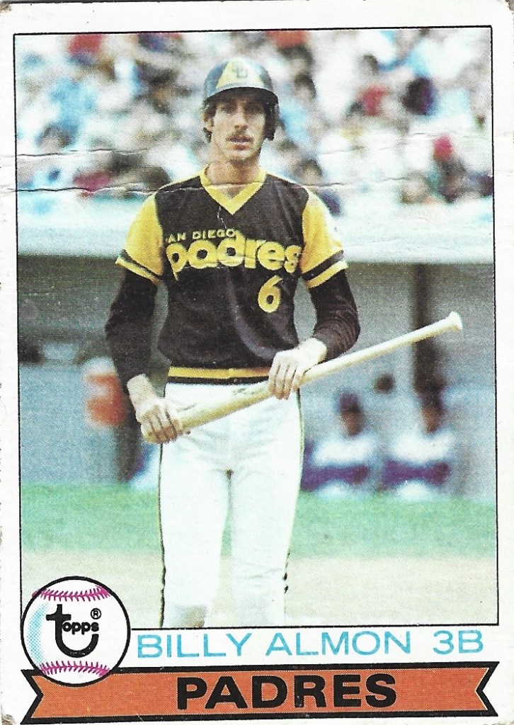 This is one of my favorite baseball cards. It’s an action shot, but what is the action? In some other famous cards with action shots, the action captures an element of the game that’s at the heart of why the game came to mean so much to us, the drama, the excitement, the heroism. I think of the 1974 Cleon Jones card that is in my mind the first baseball card I ever saw, the one that started to lay the whole foundation of my conscious mind. For what is my mind but something built on baseball cards, on early childhood attachment interwoven with a want and need to attach to my older brother and to all things colorful and exciting? Everything before baseball cards was unconscious, and everything after it had within it at least some fragment of baseball cards. I’m living and have been living in the after for a long time. The after changes. I think about another iconic action card, Johnny Bench’s 1976 card, where he stands amid swirling dust like a gunslinger who’s just gunned down another challenger. That’s an after wherein the before seems so close at hand it crackles with life, an after that suggests itself as part of a continuum of drama and action and victory. The action shown in this Billy Almon card tells a different story. Billy Almon is clearly returning to the dugout after failing to reach base. If he were approaching home plate for an at-bat, he wouldn’t be holding the bat this way. He’s holding it in such a way as to enable a handoff to a bat boy. He has not only failed to reach base but has failed to even put the ball in play. He has struck out. This is why he’s still in possession of the bat. His expression is implacable. He is looking at me, or if you’re the one looking at this card, he’s looking at you. You could imagine he’s about to hand you the bat, that it could be your turn. But who would want to enter such a universe as the one that has reduced him to such brown and yellow and gray mediocrity? In truth I didn’t get this card as a kid but received it as part of a dumping of old cards on me last year from a friend of a friend who was getting rid of his collection. So I never had the experience of seeing it as a kid, when my favorite thing in all the world was playing little league baseball, and my favorite moment in little league baseball was being on deck, bat in hand, about to get an at-bat. Now I’m on the other side of most things. I’m not who Billy Almon is looking at. I’m Billy Almon, or standing in Billy Almon’s place, more or less. This is not such a bad thing. I’ve been blessed with a staggering amount of gifts in my life, and still out in front of me are the lives of my two sons, who are as young now as I was when baseball cards were forming my brain. From what I can tell, Billy Almon is accepting his fate with dignity and care. He stands upright. He hasn’t thrown his bat away in a tantrum but holds it carefully. He is going to hand it gently to the boy with his whole life in front of him.