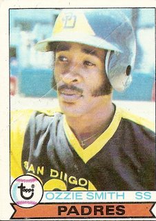 I’m guessing that it wasn’t long before Ozzie Smith became The Wizard. The greatest fielding shortstop ever is featured here in his 1979 rookie card (which I have taken my usual exemplary care of, judging from the prominent crease running diagonally through his quizzical, slightly mournful expression), and I’m thinking that even by the time this card came out his Padre teammates were looking up to him. There was undoubtedly something about him–related but not wholly confined to his spectacular defensive play–that suggested his future greatness. I imagine his Padre teammates gravitating to him for support, for here was a man who, though only 5’10”, was able to stand up tall in the sinking quicksand of Padreness.