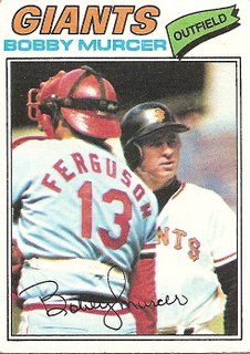 Anyway, today I got up and for fucking six hours I have been trying and failing to write about Bobby Murcer. I tried writing about the odd picture on this card, an opposing player taking up more of the picture than Murcer. I played a couple hands of solitaire, you know, to “loosen up.” I wandered around on the Internet and discovered that this photo must have been taken during the second game of a doubleheader on July 18, 1976, because that is the only time Joe Ferguson caught for the St. Louis Cardinals in a road game against the San Franscisco Giants. I also found out that on that very same day, at the 1976 Summer Olympics, Nadia Comaneci’s performance on the uneven bars garnered the very first perfect 10 ever awarded. I tried to write about perfection but the writing was atrocious. I took a break and ate a sandwich. Halfway through the sandwich I took a digital photo of our cats, who were lying together in a cute way on the couch. While finishing up the sandwich I bit my tongue pretty badly and stomped around for a few moments feeling sorry for myself. I went to the bathroom and stuck my tongue out at my reflection. My tongue was bleeding a little. Why me? Then I went back to the computer and tried again to write about Bobby Murcer, who seems to strike most people as a very nice man. I got nowhere.