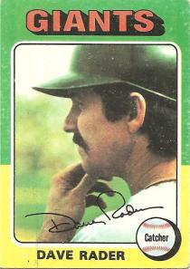 This Dave Rader card would have produced that sensation, back when I first held it in 1975. The close-up, intimate portrait of a man seemingly unaware that the camera is on him: it’s strikingly different from the occasional action shots and from the awkward, self-conscious wax figure portraits that were so common especially in that first year of my baseball card collecting. From the blurry backdrop, more likely some training compound trees than the stands of a major league park, it appears the figure in the extreme foreground must be at spring training, perhaps in the very early days of it, in late February, just pitchers and fellow catchers and him. Dave Rader is wondering about his place in it all, wondering if it’s all still to come or already gone. (As it turned out, he was just about in the middle of a decent ten-year career as a part-time catcher with an above average left-handed batting stroke.)