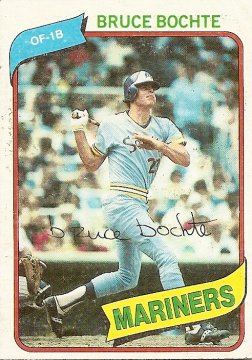 This 24-hour pornographic movie theater in my mind opened around the time I got the 1980 Bruce Bochte card shown above. I was 12 years old and in 8th grade and as I believe I’ve mentioned before I had recently discovered that the girls around me were bulging through their clothes in hauntingly interesting ways. My god, how I clung to box scores and the Sunday batting averages in those days, clung as I never had before and never would again. I specifically remember clinging to Bruce Bochte, to his name that is, which had in previous years not been among the league leaders in the batting average list printed in the Sunday paper, but now suddenly here he was, an exciting new arrival in the land of Carew and Brett. Though in later years he would recede into a haze that would have me confusing him with Bruce Bochy (who I in turn confused with Bob Brenly, who was nominally entangled with Bruce Berenyi), at the dawn of my troubling, painful puberty Bruce Bochte rang like a bell through the fog, trying to guide me back home, and I in turn tried to walk toward the sound as best I could but more and more just ended up ducking into the aforementioned 24-hour pornographic movie theater in my mind, where the future owner of the general store in the closest thing I have to a hometown was always shedding her tight 8th grade gym clothes and running toward me with voracious enthusiasm.