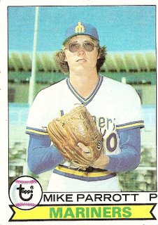Anyway, Mike Parrott seems here to be on the brink of a humiliating discovery, his eyes fixed on the horizon as if an airplane skywriter is spelling out the last letters of a message that Mike Parrott’s wife has run away with some other Mariner that Mike Parrott has always fervently believed to be a douchebag. In the season to come, Mike Parrott will valiantly battle the creeping self-doubt apparent in this picture, going 14-12 with a respectable 3.77 ERA. He will even begin the following year with a win, but then he will lose every single other game that year, 16 games in a row, to finish 1-16. I don’t know if Mike Parrott’s tinted glasses contributed to the monumental losing streak, but one has to wonder why a guy whose home games were in the roofed Kingdome would be drawn to glasses that were always a little too dark when the wearer of them was inside.