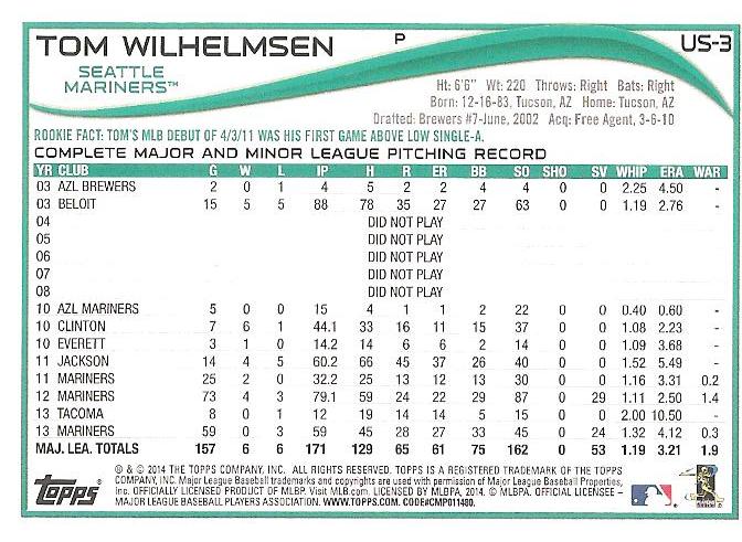 I’m talking about all the years of pure disappearance. It’s the longest such stretch in history—it must be. DID NOT PLAY for year after year. Two years into his minor league career, Tom Wilhelmsen bailed and stayed gone for six years before circling back. Actually the card seems to be erroneous on this account, as it doesn’t include a sixth DID NOT PLAY for 2009.