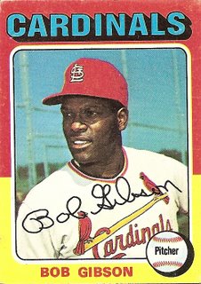 This card marks Bob Gibson’s first and last appearance in the world of my Cardboard Gods. Like a lot of other 1975 cards, this one is a little off-center, a facet that seems OK, or even somehow appealing, when part of, say, Ed Brinkman’s card, but in this card it just seems wrong, like if Sidney Poitier’s last public appearance involved sitting on a small booby-trapped platform above the rusty hose-water of a county fair dunking booth. The dipping of his right shoulder creates the impression that Bob Gibson is actually teetering slightly to his right with the queasy yawing of the lopsided card. Bob Gibson’s expression, however, makes it clear that even if the whole goddamn world started flopping and flailing like a boated fish, Bob Gibson himself would not go down.